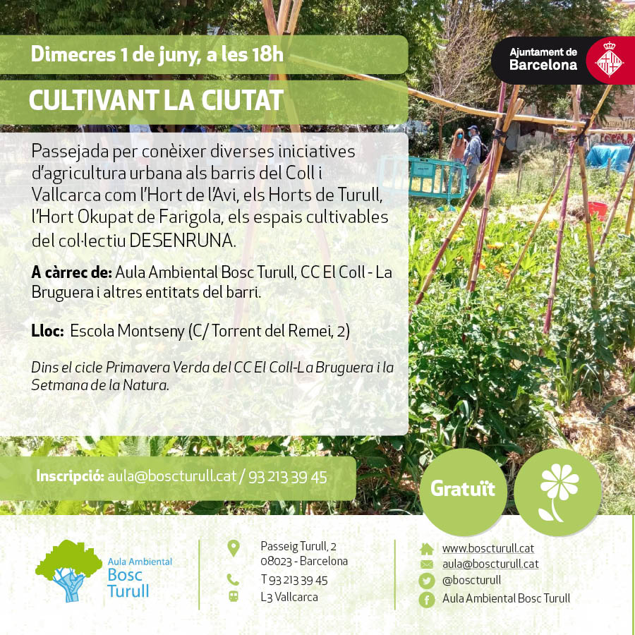 Sabíeu que als nostres barris existeixen diferents iniciatives per promoure l’agricultura urbana? En aquesta passejada visitarem l’Hort de l’Avi, els Horts Municipals i els Horts Comunitaris de Turull, l’Hort Okupat de Farigola i els diferents espais cultivables del col·lectiu DESENRUNA. Coneixerem les diferents tipologies d’hort i d’organitzar-se, els valors ambientals i socials que aporten al territori i actualitzarem aquests punts d’interès agroecològic al Mapa Barcelona + Sostenible.