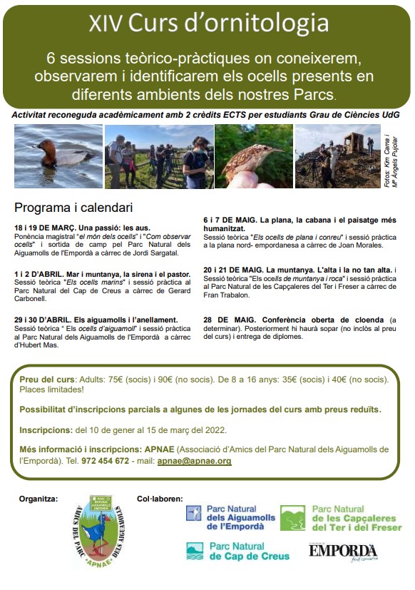 Un any més l’APNAE organitza el “ XIV Curs d’iniciació a l’ornitologia” per a descobrir l’apassionant món de les aus. El curs s’organitza en 6 sessions teòrico-pràctiques on coneixerem, observarem i identificarem els ocells presents en diferents ambients dels nostres Parcs.