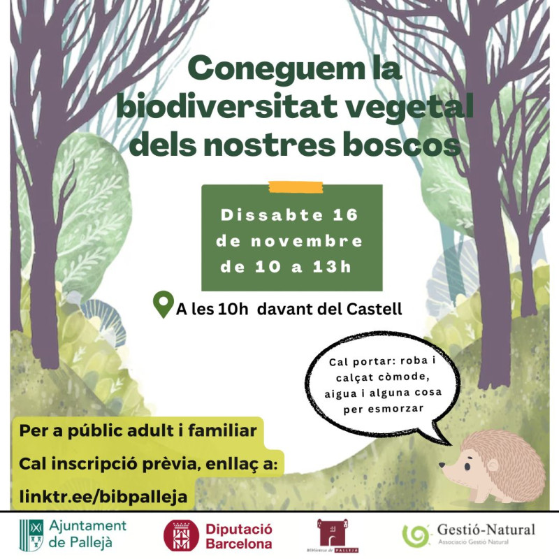 Amb la col·laboració de l’Associació Gestió Natural, les persones participants podran fer un recorregut pels boscos propers amb l’objectiu d’aprendre i descobrir l’entorn natural que tenim al nostre abast. Sota el nom ‘Coneguem la biodiversitat vegetal dels nostres boscos’, l’Ajuntament i la Biblioteca de Pallejà, amb el suport de la Diputació de Barcelona, ofereixen una activitat familiar de descoberta de l’entorn. Aquesta es desenvoluparà el pròxim dissabte 16 de novembre de 10 a 13 hores, i està destinada a un públic adult i familiar.