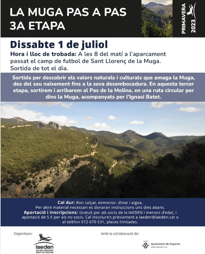 Sortida per descobrir els valors naturals i culturals que amaga la Muga, des del seu naixement fins a la seva desembocadura. En aquesta tercer etapa, sortirem i arribarem al Pas de la Molina, en una ruta circular per dins la Muga, acompanyats per l’Ignasi Batet.
