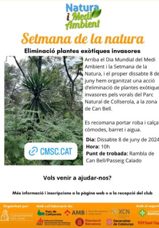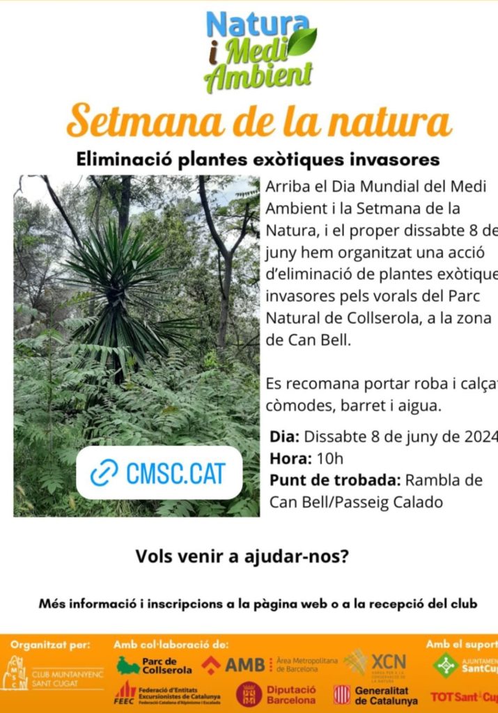 Amb motiu de la celebració del Dia Mundial del Medi Ambient, des de la Secció de Natura i Medi Ambient del Club, en col·laboració del Consorci del Parc Natural de la Serra de Collserola, s’ha organitzat pel proper dissabte 8 de juny una activitat d’eliminació de plantes exòtiques invasores per la zona de la Rambla de Can Bell de Sant Cugat. L’activitat consistirà en identificar les espècies de plantes exòtiques invasores més comuns, per després localitzar-les i registrar-les, i finalment eliminar-les amb eines diverses. Serà una activitat matinal de 10 a 13 h aproximadament. L’actuació es farà a la zona propera a la rambla de Can Bell, la hípica Severino i el camí de la pedrera