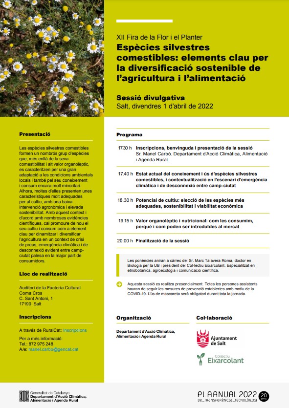 Les espècies silvestres comestibles formen un nombrós grup d’espècies que, més enllà de la seva comestibilitat i alt valor organolèptic, es caracteritzen per una gran adaptació a les condicions ambientals locals i també pel seu coneixement i consum encara molt minoritari. Alhora, moltes d’elles presenten unes característiques molt adequades per al cultiu, amb una baixa intervenció agronòmica i elevada sostenibilitat. Amb aquest context i d’acord amb nombroses evidències científiques, cal promoure de nou el seu cultiu i consum com a element clau per dinamitzar i diversificar l’agricultura en un context de crisi de preus, emergència climàtica i de desconnexió evident entre camp-ciutat palesa en la major part de consumidors.