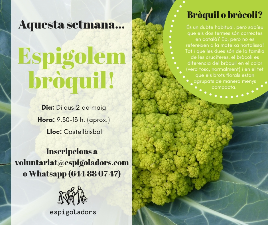 Espigolada de bròquil dijous 2 de maig 2019 09:00h fins 14:00h Castellbisbal Castellbisbal Tothom Espigoladors Contacte: voluntariat@espigoladors.com Informació Ubicació Espigolada de calçots a Molins de Rei Espigoladors/es, seguim al camp a ritme de primavera! T’animes? Observacions Inscriu-te a l'adreça voluntariat@espigoladors.com Compartir: Castellbisbal Castellbisbal Baix Llobregat