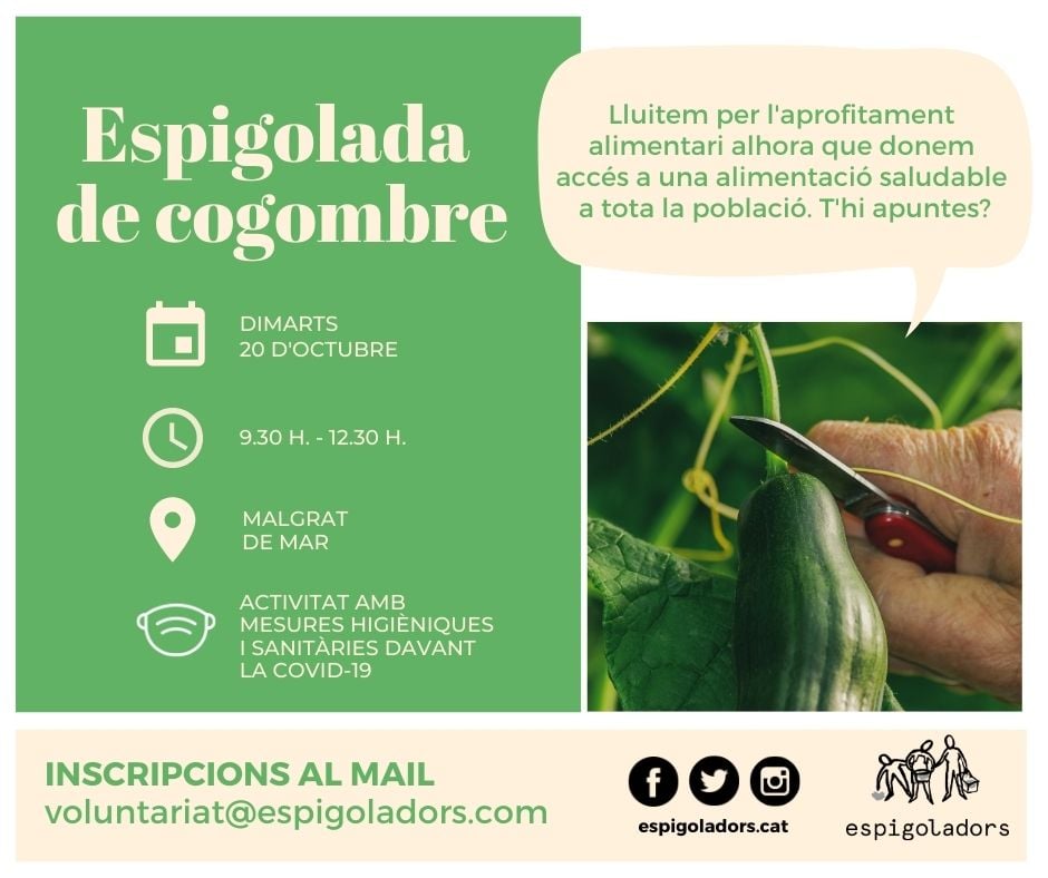 Espigolada de cogombres dimarts 20 d’octubre 2020 10:00h fins 13:00h Malgrat de Mar Malgrat de Mar Tothom Voluntariat Espigoladors Contacte: voluntariat@espigoladors.com Informació Ubicació Gent bonica del Maresme! Demà dimarts serem a Malgrat de Mar espigolant cogombre. Necessitem voluntaris/es! ?Us hi animeu? ?Malgrat de Mar ?Dimarts, 20 d’octubre ?9.30-12.30 h Inscripcions a voluntariat@espigoladors.com Compartir: Malgrat de Mar Malgrat de Mar Maresme