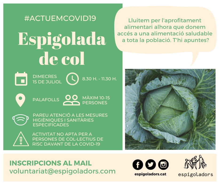 Espigolada de cols a Palafolls dimecres 15 de juliol 2020 08:30h fins 11:30h Palafolls Palafolls toothom Espigoladors Contacte: voluntariat@espigoladors.com Informació Ubicació Demà serem a #Palafolls espigolant un camp de cols i necessitem voluntaris/es! Us hi sumeu? Dimecres, 15 juliol, 8.30-11.30 h Inscripcions a voluntariat@espigoladors.com Compartir: Palafolls Palafolls Maresme