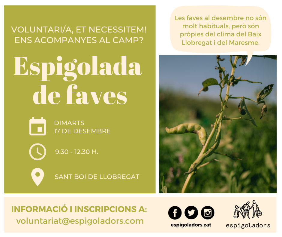 El proper dimarts dia 17 de desembre espigolarem un camp de faves a prop de Sant Boi del Llobregat i necessitarem persones voluntàries en horari de 9.30h fins 12.30h. Els qui estigueu interessats en venir responeu aquest mail i us donarem més informació. Gràcies!