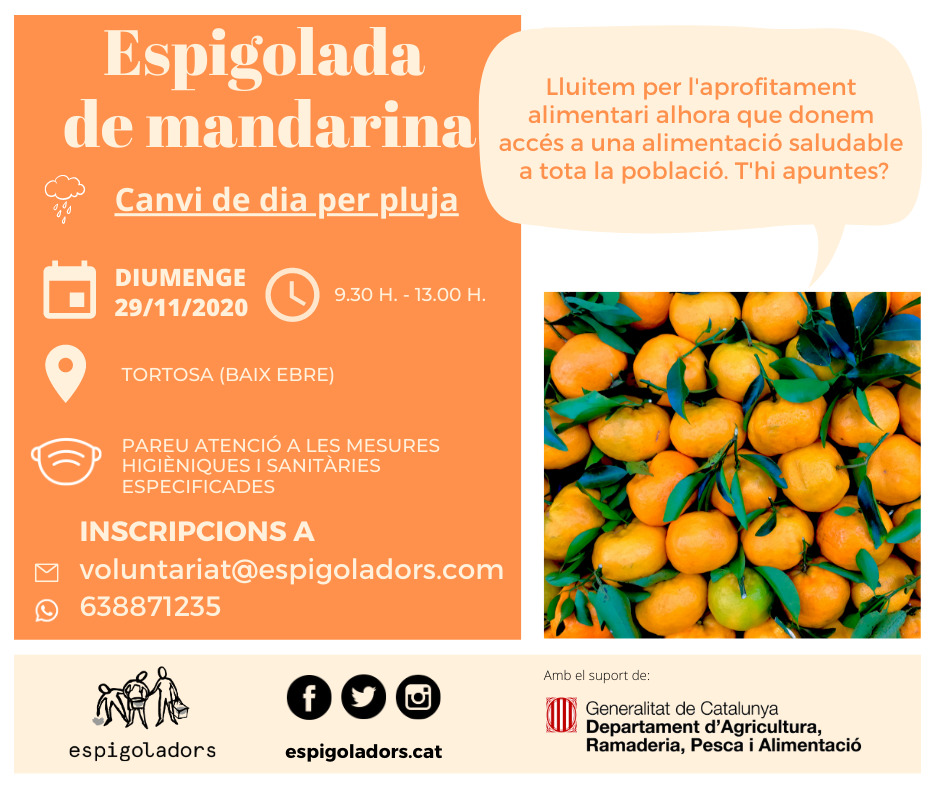 DIUMENGE 29 de novembre, de 9.30 h. a 13.00 h., serem a Tortosa per espigolar un camp de mandarines. Tot el que recuperem anirà destinat a les entitats socials, amb l’objectiu de donar accés a una alimentació saludable a persones en situació vulnerable.