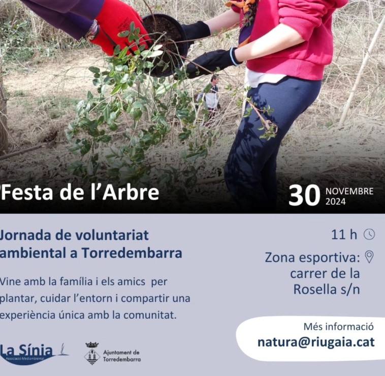 Festa de l’Arbre a Torredembarra dissabte 30 de novembre 2024 Zona Esportiva Torredembarra Voluntariat Associació Mediambiental La Sínia Contacte: natura@riugaia.cat Informació Ubicació Arriba la ‘Festa de l’Arbre’ a Torrembarra Voluntariat Ambiental 30 de novembre : jornada oberta! Vine amb família i amics per compartir l’experiència Més informació: natura@riugaia.cat Compartir: Zona Esportiva carrer de la Rosella s/n Torredembarra Tarragonès