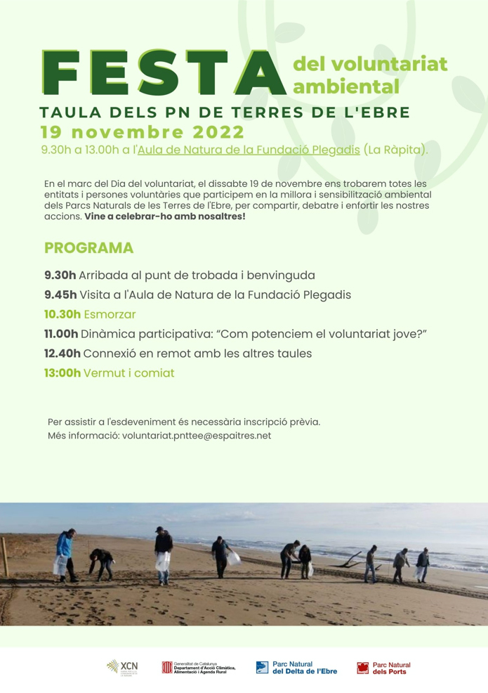 En el marc del Dia del voluntariat, el dissabte 19 de novembre ens trobarem totes les entitats i persones voluntàries que participem en la millora i sensibilització ambiental dels Parcs Naturals de les Terres de l’Ebre, per compartir, debatre i enfortir les nostres accions. Ets voluntari/a dels ENPE de Terres de l’Ebre? Vine a celebrar-ho amb nosaltres!