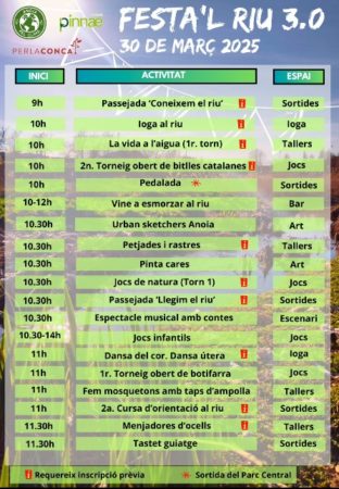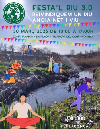 - 9:00h- 11h Passejada “Coneixem el riu” .Després podreu esmorzar coca i xocolata amb nosaltres a les 10 del matí . Amb la col.laboració de la UEC Anoia : veurem diferents estats del riu Anoia i les seves problemàtiques, al llarg de 8 km. amb 100mts. de desnivell.
