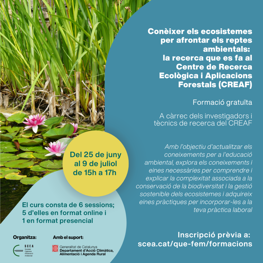 Des de la SCEA oferim una acció formativa dirigida a educadors ambientals i persones que treballin en recerca de l’educació ambiental. La formació crearà un context d’intercanvi i trobada amb investigadors i investigadores del CREAF vinculats a la recerca en Ecologia.