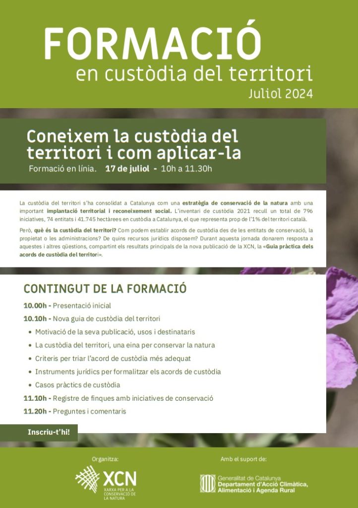 Però, què és la custòdia del territori? Com podem establir acords de custòdia des de les entitats de conservació, la propietat o les administracions? De quins recursos jurídics disposem? No et perdis aquesta formació gratuïta teòrico pràctica que es durà a terme el 17 i el 19 de juliol