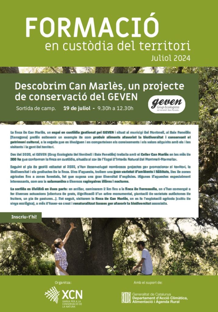 - La finca de Can Marlès, un espai en custòdia gestionat pel GEVEN i situat al municipi del Montmell, al Baix Penedès (Tarragona) pretén esdevenir un exemple de com produir aliments afavorint la biodiversitat i conservant el patrimoni cultural, a la vegada que es divulguen i es comparteixen els coneixements i els valors adquirits amb els i les visitants i la gent del territori.