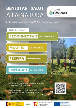 El projecte GiroNat té com a objectiu impulsar la biodiversitat i infraestructura ecològica per portar la ciutat cap a la renaturalització urbana, transformant Girona en una ciutat més verda, resilient i saludable. En el marc del GiroNat s’organitzen a la capital gironina diverses activitats gratuïtes durant la primavera 2025, amb un programa propi per apropar-nos a reconnectar amb la natura.