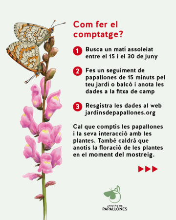 Emmarcat dins del projecte Jardins de papallones, voluntaris d’arreu del territori podreu participar d’aquest gran comptatge fent mostrejos de 15 minuts al vostre jardí. Aquí hi trobareu tot el material necessari per a fer el seguiment.