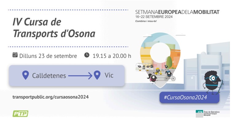 El proper dilluns 23 de setembre a les 7 del vespre, la PTP, juntament amb l’ATM de Barcelona i la Generalitat i en el marc de la Setmana Europea de la Mobilitat, celebra la IV Cursa de Transports d’Osona, amb el suport de la resta de col·lectius que treballen per la mobilitat sostenible a la comarca. Un any més, recuperem aquesta activitat i, com sempre, volem que participar-hi sigui una experiència única.