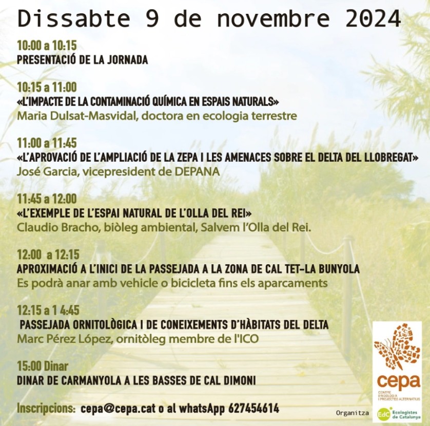 - 11.00 a 11.45 hores: ‘L’aprovació de l’ampliació de la ZEPA i les amenaces sobre el Delta del Llobregat’ a càrrec de José García, vicepresident de DEPANA.