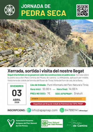 Xerrada, sortida i visita del nostre llegat. Seguit d’activitats on es posarà en valor les construccions en pedra seca: En primer lloc hi haurà una xerrada sobre la pedra seca d’en Marc Cortina de l'entitat de Museu de camins. Es seguirà amb l'explicació de ?La Wikipedia, aplicació per mòbils, després una visita a la terra de còdols de l’ermita del Roser de Tírvia i per acabar una altra visita al forn de calç de la Bana.