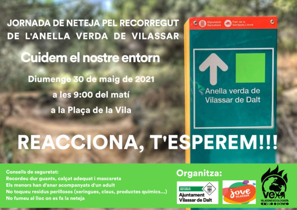 Jornada de neteja a l’Anella Verda de Vilassar de dalt, en la qual recollirem deixalles resseguint aquest recorregut marcat al voltant del poble. Punt de trobada: Plaça de la Vila a les 9:00 h. Hi haurà esmorzar, i explicació de l’ acció. Es proporcionaran el necessari per la recollida, inclós transport de les deixalles . Les deixalles es seleccionaran un cop portades a la Plaça de la República per fer visible l’ impacte mediambiental, i romandràn allà fins que la Brigada Municipal les reculli al dia següent. Inscripció lliure i voluntària.