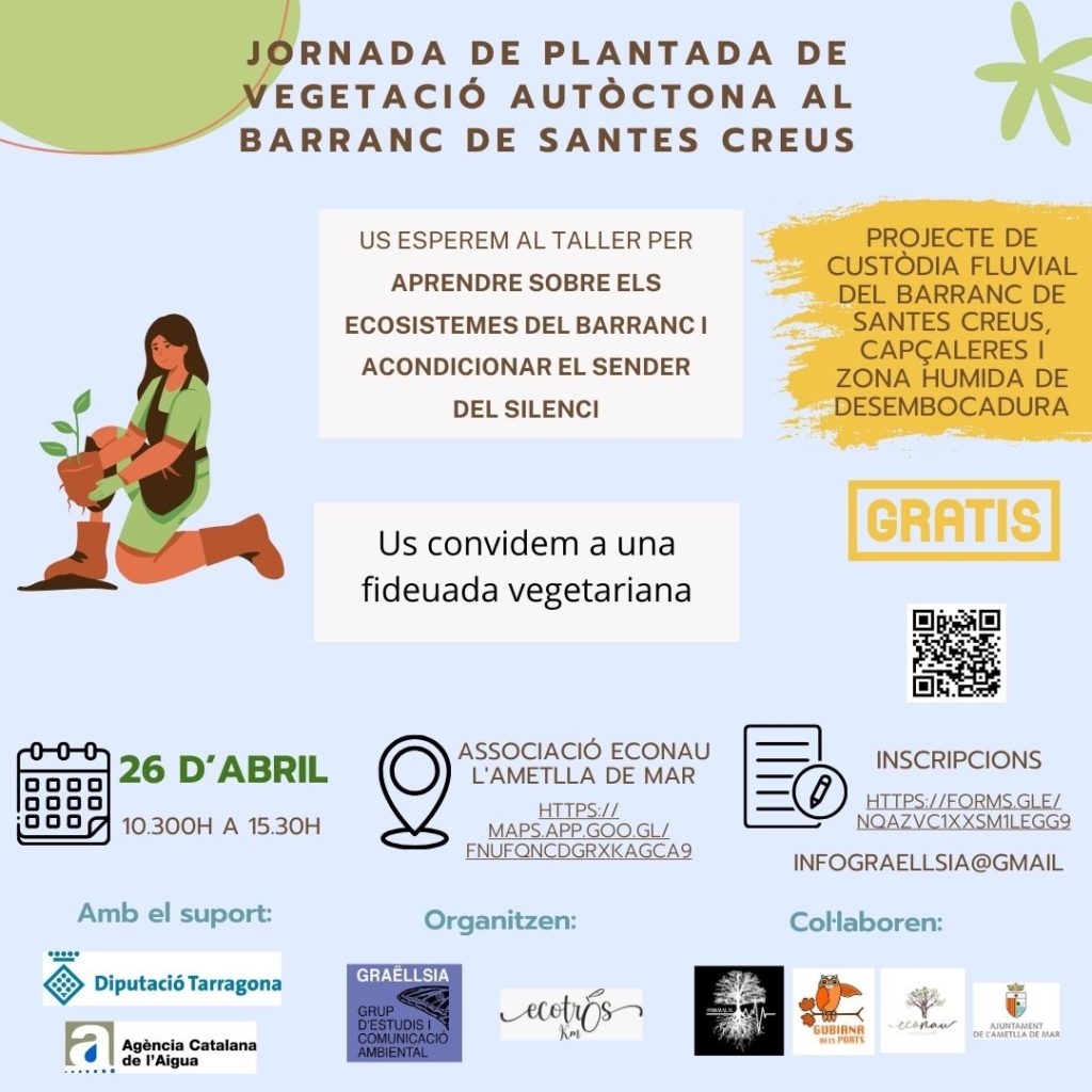 Ens trobem al Barranc de Santes Creus, al cor de les Terres de l’Ebre, per recuperar el Sender del Silenci amb la plantació d’espècies autòctones i una jornada de neteja i restauració ambiental.
