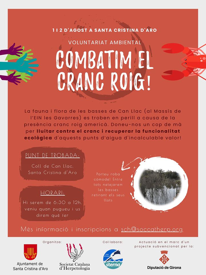 Aquest cap de setmana (dies 1 i 2 d’agost) organitzem un voluntariat ambiental per eradicar el cranc de riu americà a dues basses de Santa Cristina d’Aro (al coll de Can Llac). Buidarem les basses, capturarem crancs i retirarem els llots. Doneu-nos un cop de mà i ajudeu-nos a recuperar els hàbitats aquàtics ara molt degradats a causa d’aquesta espècie exòtica invasora!