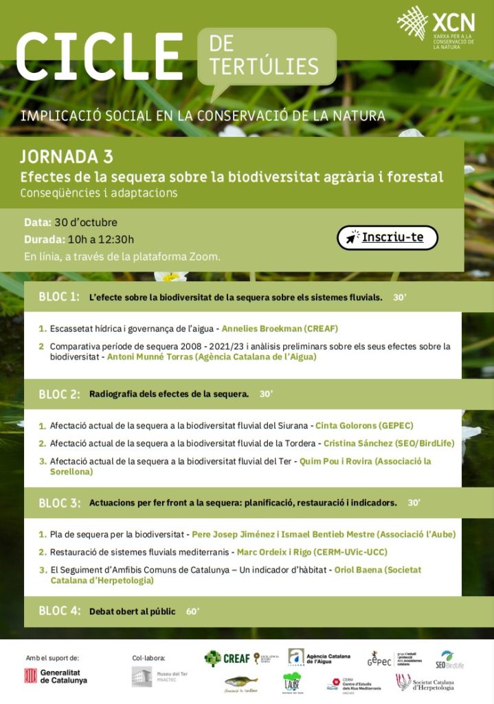 Aquest cicle de tertúlies ofereix una plataforma per comprendre millor els reptes que la sequera presenta per a la biodiversitat i explorar solucions pràctiques per a la seva conservació. Us animem a participar i compartir les vostres idees i experiències!