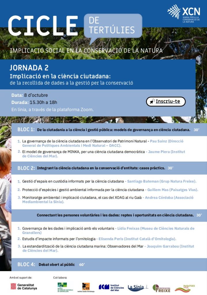 El 8 d’octubre, la segona tertúlia, se centrarà en la ciència ciutadana i la governança de dades en projectes de conservació. La jornada començarà amb ponències sobre la governança dels projectes de ciència ciutadana a Catalunya i la gestió de les dades generades.