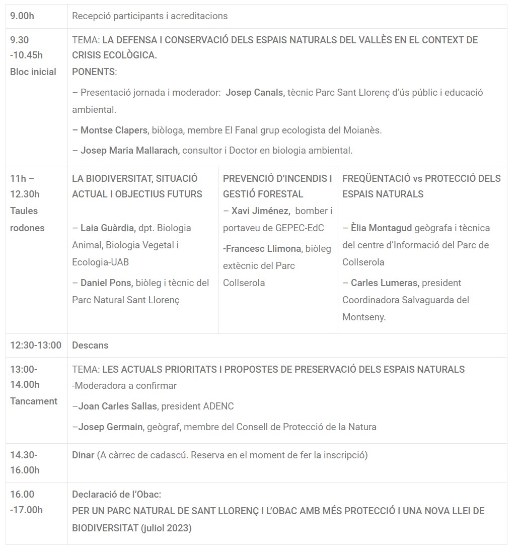 A més a més un dels objectius de la trobada és posar sobre la taula la necessitat d’una llei de biodiversitat a Catalunya i fer una revisió sobre la proposta d’ampliació del parc natural de Sant Llorenç del Munt i l’Obac.
