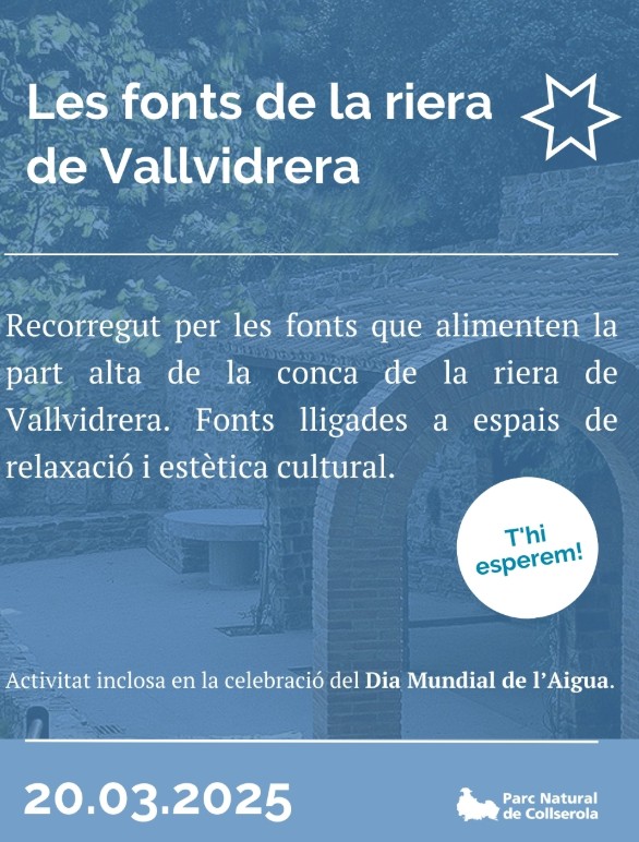Recorregut per les fonts que alimenten la part alta de la conca de la riera de Vallvidrera. Fonts lligades a la necessitat del manteniment de la vida i alhora espais de relaxació i estètica cultural.