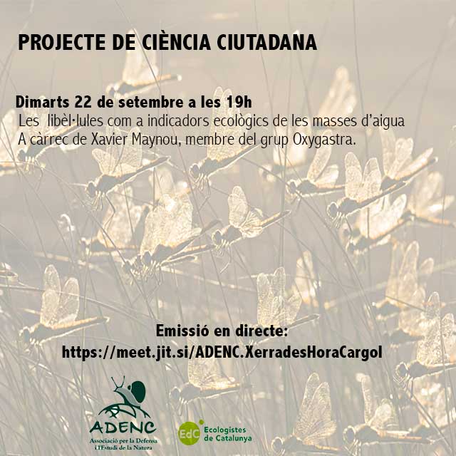 Sessió formativa per conèixer diferents aspectes del cicle biològic, els ambients on viuen, com s’alimenten, les principals famílies i espècies de libèl.lules que podem trobar a Catalunya, i el seu paper com a indicadors de l’estat ecològic de les masses d’aigua.