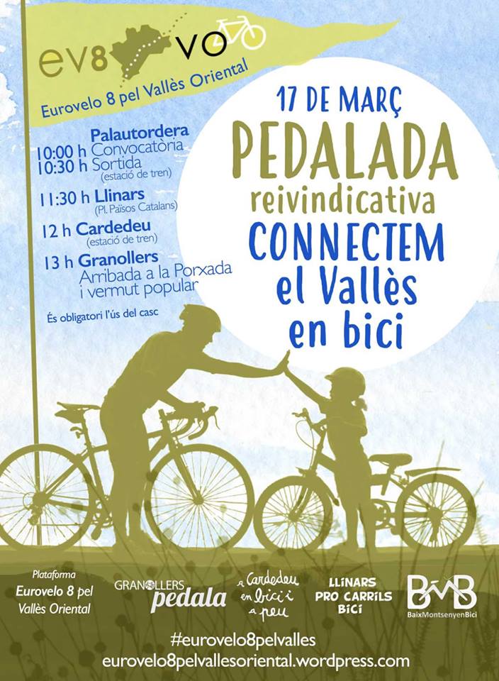El proper diumenge 17 de març convoquem la població del Vallès Oriental a la MANIFESTACIÓ AMB BICICLETA per reclamar una xarxa pedalable que connecti les poblacións de la comarca, i el pas de la ruta Eurovelo 8 pel territori vallesà.