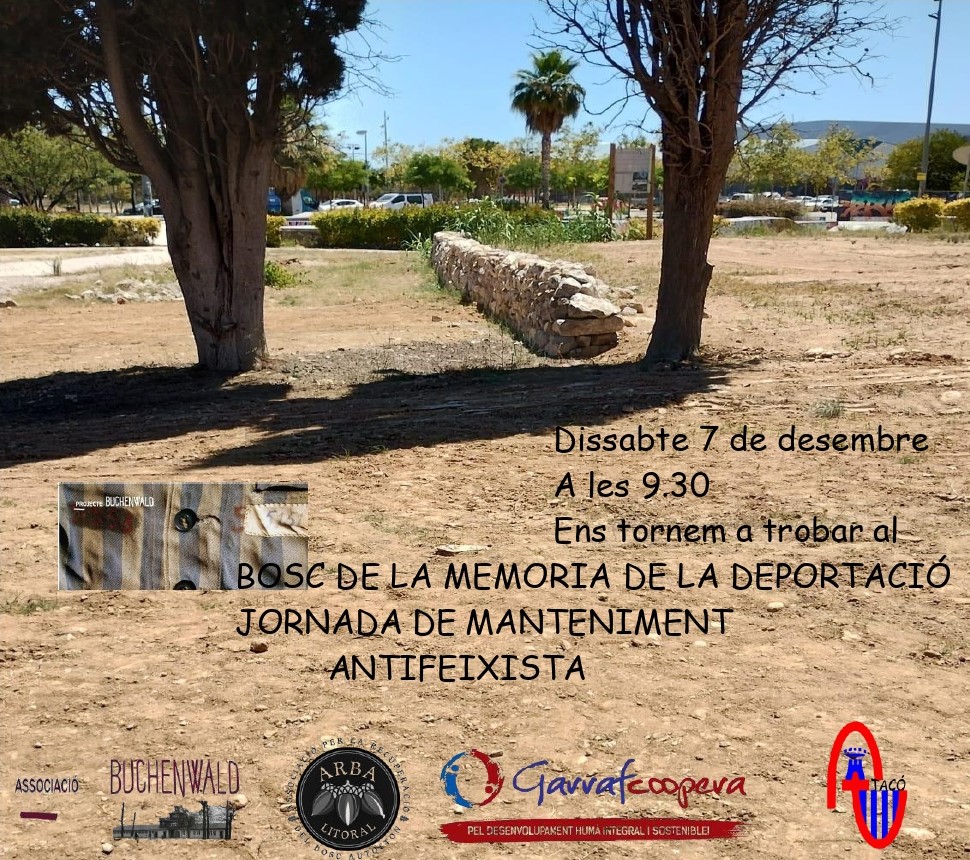 Les entitats promotores d’aquest projecte memorialista i ambientalista, Amical de Buchenwald, ARBA Litoral, Garraf Coopera i l’AAVV del barri del Tacó convoquem el proper dissabte 7 de desembre al matí, una nova jornada antifeixista de construcció i manteniment del Bosc de la Memòria de la Deportació, un projecte que vol ser un monument viu en memòria i record dels 35 deportats del Garraf als camps nazis, d’aquestes persones lluitadors i resistents antifeixistes que van lluitar contra el franquisme i contra el nazisme per defensar la República, la llibertat i els Drets Humans.