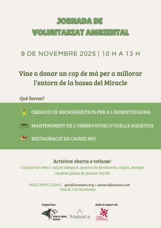El 9 de novembre de 2025, de 10 h a 13 h, ens trobarem al Santuari del Miracle per una jornada de voluntariat ambiental. Durant el matí treballarem per millorar la biodiversitat de l’entorn de la bassa del Miracle.