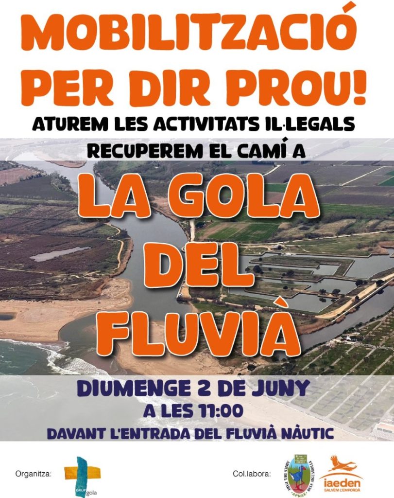 El Grup en Defensa de la Gola del Fluvià amb el suport de Iaeden i Apnae crida a una concentració el dia 2 de juny a les 11,00 davant l’entrada al Fluvià Nàutic per exigir que les administracions públiques actuïn de manera efectiva i contundent davant d’un promotor que actua de manera il•legal i no fa cap cas a les obligacions fixades per les administracions.