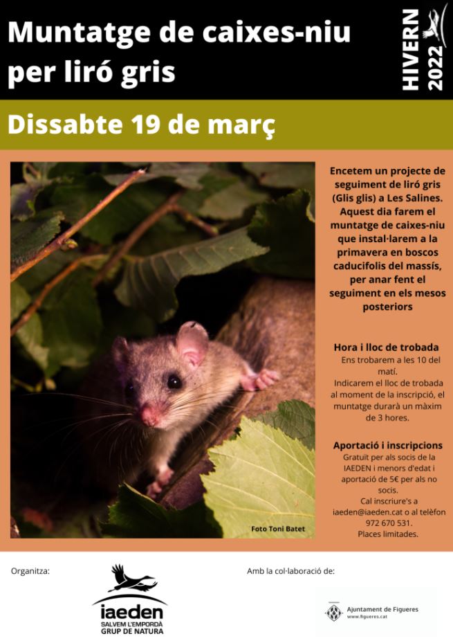 Encetem un projecte de seguiment de liró gris (Glis glis) a les Salines. Aquest dia farem el muntatge de caixes-niu que instal·larem a la primavera en boscos de caducifolis del massís, per anar fent el seguiment en els mesos posteriors.