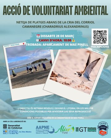 El proper 28 de març organitzem una jornada de neteja de les platges del Montgrí Medes Baix Ter abans de l’inici del període de cria del corriol camanegre (Charadrius alexandrinus), una espècie protegida que nidifica a la sorra.