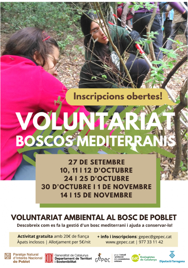Després de dues edicions realitzades amb èxit, el Voluntariat de Boscos Mediterranis encara la tercera, que començarà amb una primera jornada el 27 de setembre i acabarà el cap de setmana del 14 i 15 de novembre. Aquest és un projecte de voluntariat es va iniciar la tardor del 2018 per iniciativa del Paratge de Poblet. Els principals objectius són acostar la gestió del bosc mediterrani a les persones interessades, millorar el Bosc de Poblet i donar a conèixer aquest bosc madur i les especies que hi viuen.