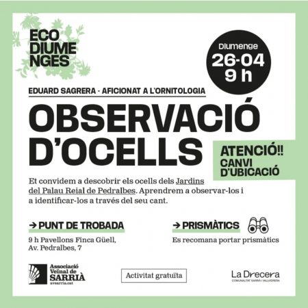 Aquest cop anirem als Pavellons de la Finca Güell, a l’Avinguda de Pedralbes, 7, a observar ocells i aprendre a identificar-los pel seu cant amb l’Eduard Sagrera.