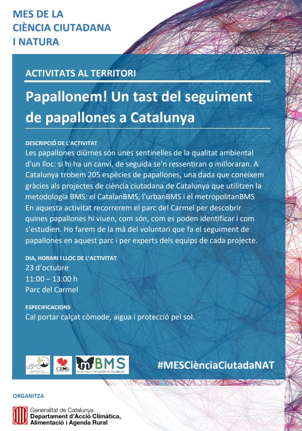 Les papallones diürnes són unes sentinelles de la qualitat ambiental d’un lloc: si hi ha un canvi, de seguida se’n ressentiran o milloraran. A Catalunya trobem 205 espècies de papallones, una dada que coneixem gràcies als projectes de ciència ciutadana de Catalunya que utilitzen la metodologia BMS: el CatalanBMS, l’urbanBMS i el metropolitanBMS En aquesta activitat recorrerem el parc del Carmel per descobrir quines papallones hi viuen, com són, com es poden identificar i com s’estudien. Ho farem de la mà del voluntari que fa el seguiment de papallones en aquest parc i per experts dels equips de cada projecte.