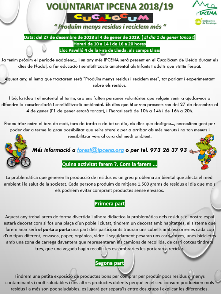 Del 27 de desembre al 4 de gener tindrà lloc el Cucalòcum de Lleida, on IPCENA organitzarà una activitat d'educació i sensibilització ambiental pels infants i adults que visitin l'espai.