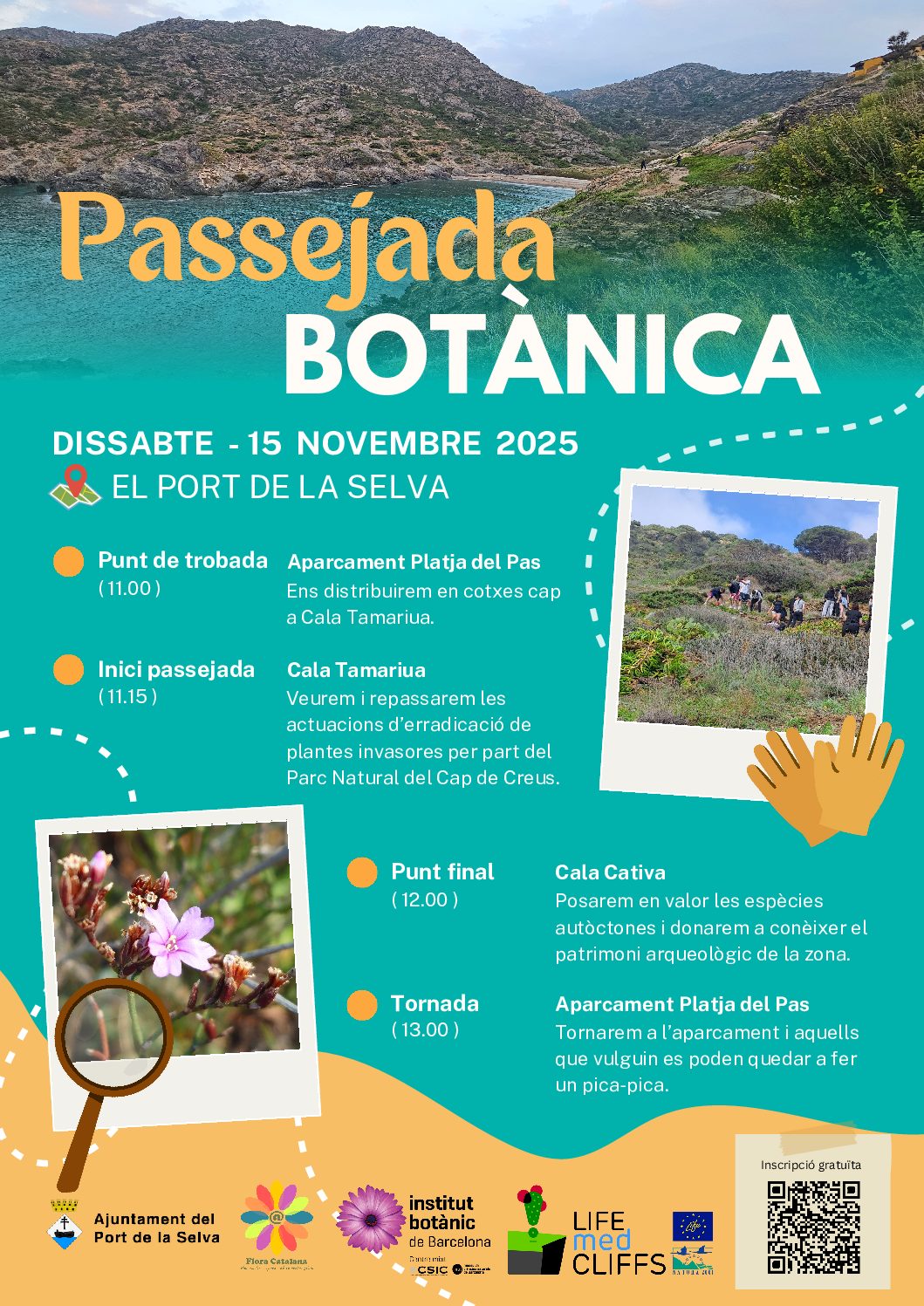 Passejada entre la Cala Tamariua fins a Cala Cativa on també es fa el seguiment des del projecte LIFE medCLIFFS i veurem la gestió de flora invasora per part del Parc Natural de Cap de Creus on podrem parar a repassar la zona i poder aportar el nostre granet de sorra.