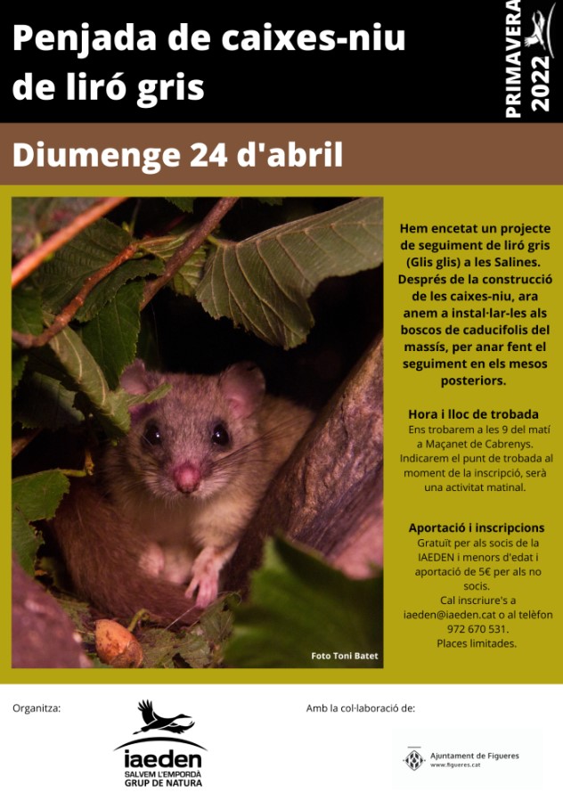 Hem encetat un projecte de seguiment de liró gris (Glis glis) a les Salines. Després de la construcció de les caixes-niu, ara les instal·larem als boscos de caducifolis del massís de les Salines, per anar fent el seguiment en els mesos posteriors.
