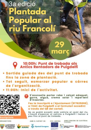 El proper 29 de març es celebrarà la tercera edició de la Plantada popular al riu Francolí de Perafort i Puigelfí. Una activitat organitzada per l’Ajuntament amb l’Associació Aurora.