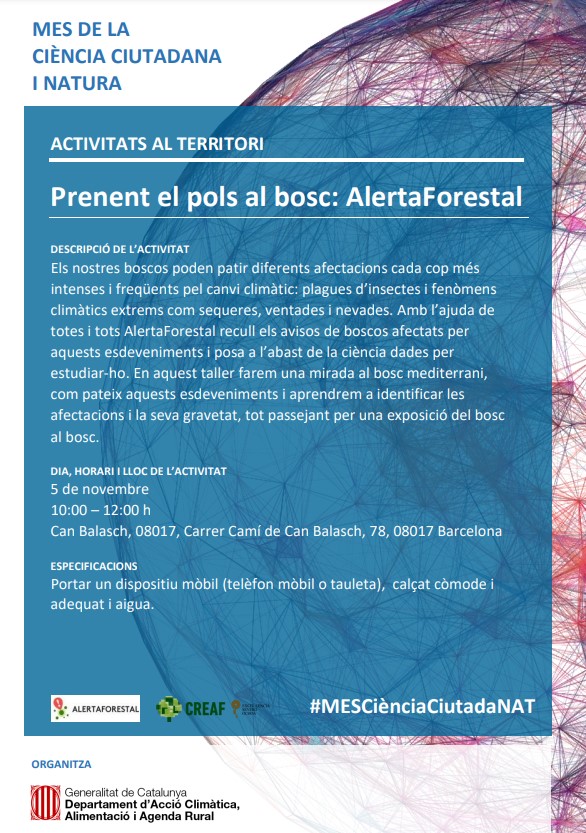 Els nostres boscos poden patir diferents afectacions cada cop més intenses i freqüents pel canvi climàtic: plagues d’insectes i fenòmens climàtics extrems com sequeres, ventades i nevades. Amb l’ajuda de totes i tots AlertaForestal recull els avisos de boscos afectats per aquests esdeveniments i posa a l’abast de la ciència dades per estudiar-ho. En aquest taller farem una mirada al bosc mediterrani, com pateix aquests esdeveniments i aprendrem a identificar les afectacions i la seva gravetat, tot passejant per una exposició del bosc al bosc.