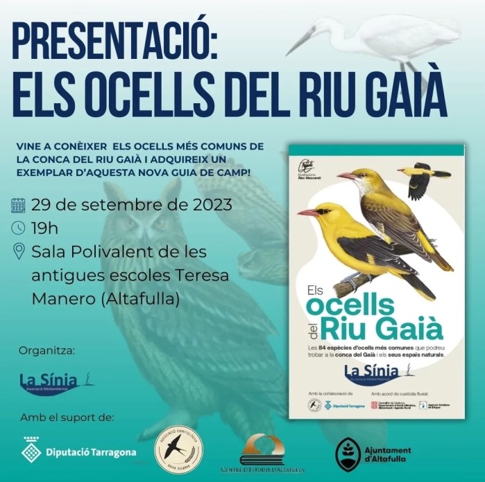 Presentació de la guia de camp: Els ocells del riu Gaià divendres 29 de setembre 2023 19:00h fins 20:00h Antigues Escoles Teresa Manero Altafulla Formació Associació Mediambiental La Sínia Contacte: voluntariat@riugaia.cat Informació Ubicació Vine a conèixer els ocells més comuns de la conca del riu Gaià Estem molt il·lusionats de poder presentar per fi la nova guia de camps: Els ocells del riu Gaià. A la Sala Polivalent de les Antigues Escoles Teresa Manero a Altafulla, 29 de setembre a les 19h Compartir: Antigues Escoles Teresa Manero Antigues Escoles Teresa Manero Altafulla Tarragonès