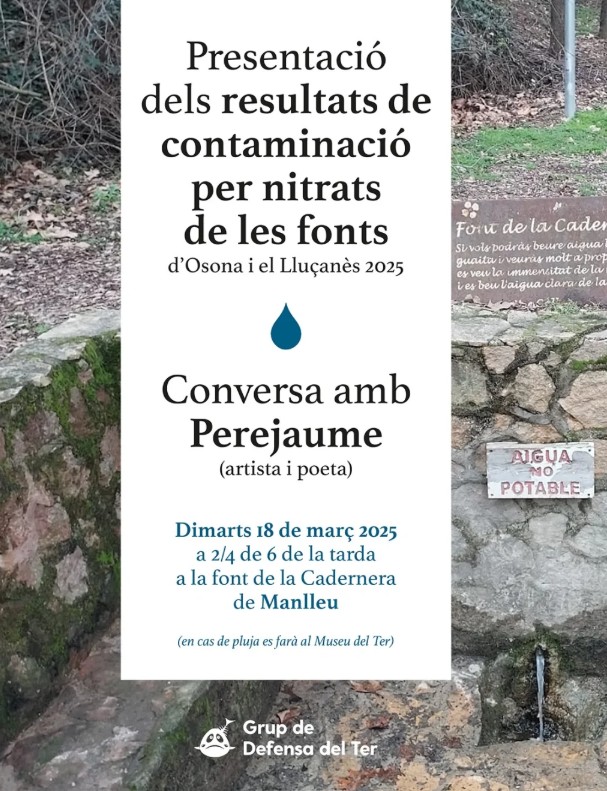 Presentació dels resultats de contaminació per nitrats de les fonts d'Osona i el Lluçanès 2025 i conversa amb Perejaume (artista i poeta) Dimarts 18 de març a 2/4 de 6 tarda a la font de la Cadernera de Manlleu (en cas de pluja es farà al Museu del Ter)