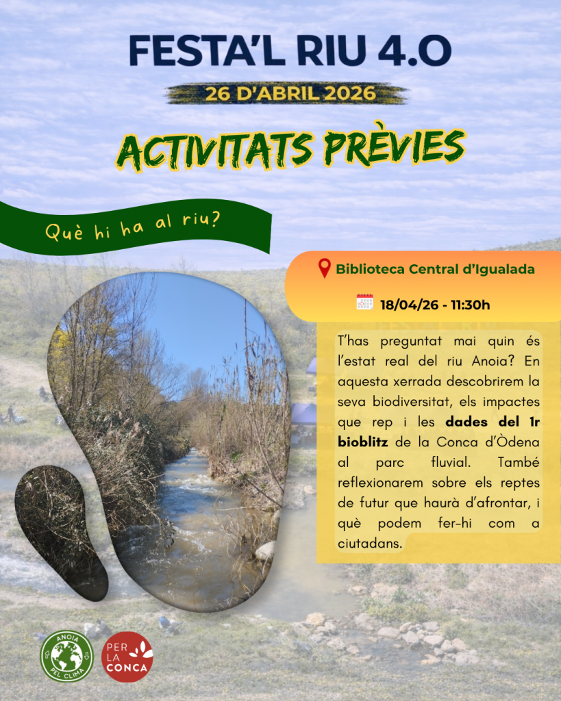 Xerrada sobre l'estat del riu Anoia a la biblioteca central d'Igualada el dia 18 d'abril a les 11:30h. No cal inscripció ni reservar plaça, xerrada oberta a tot el públic.