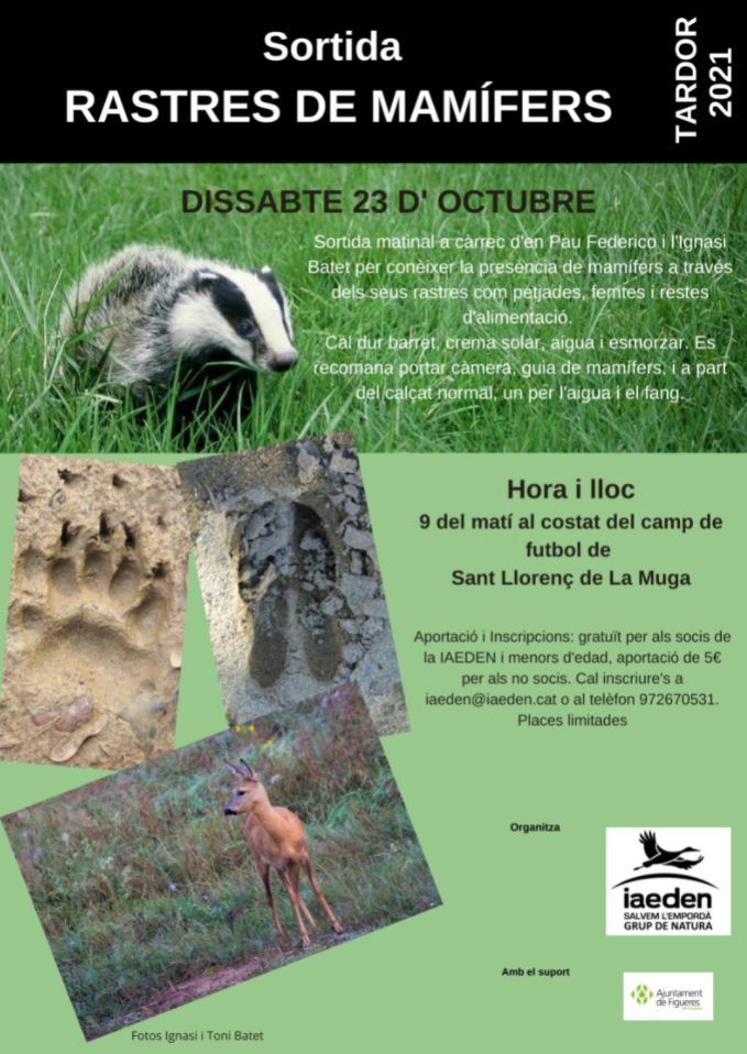 La sortida anirà a càrrec de dos especialistes en el seguiment de mamífers com són en Pau Federico i l’Ignasi Batet. A través d’un recorregut a peu per diversos ambients, anirem descobrint la presència de diferents espècies de mamífers aprenent a reconèixer els seus rastres: petjades, femtes, restes d’alimentació…