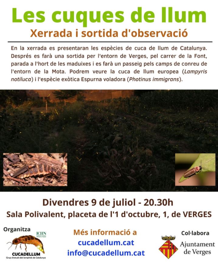Divendres 9 de juliol a 2/4 de 9 del vespre a la Sala Polivalent de Verges, esteu convidats a la xerrada i sortida d’observació “Les cuques de llum”.