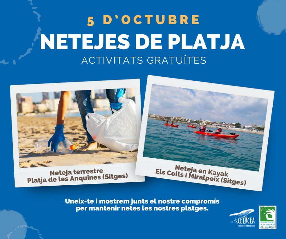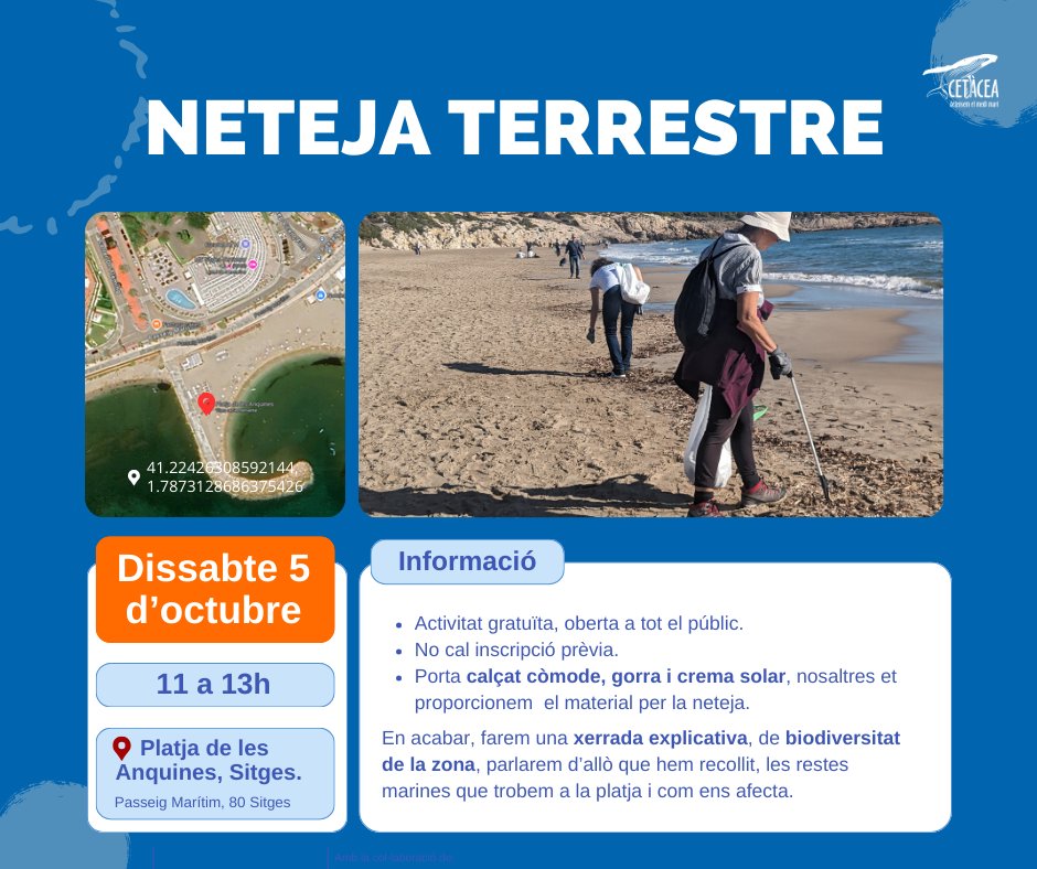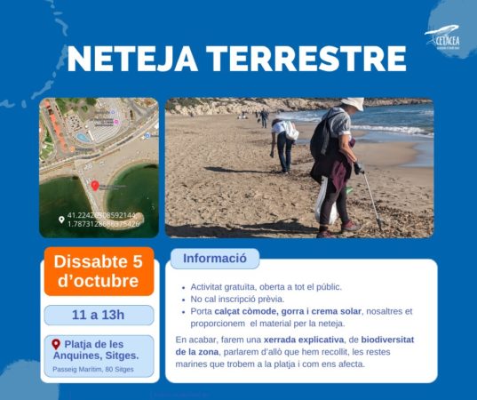 • Neteja Terrestre: Dissabte 5, d’11 a 13h. Platja de les Anquines (Sitges). No cal inscripció previa. Activitat gratuïta per tot el públic.